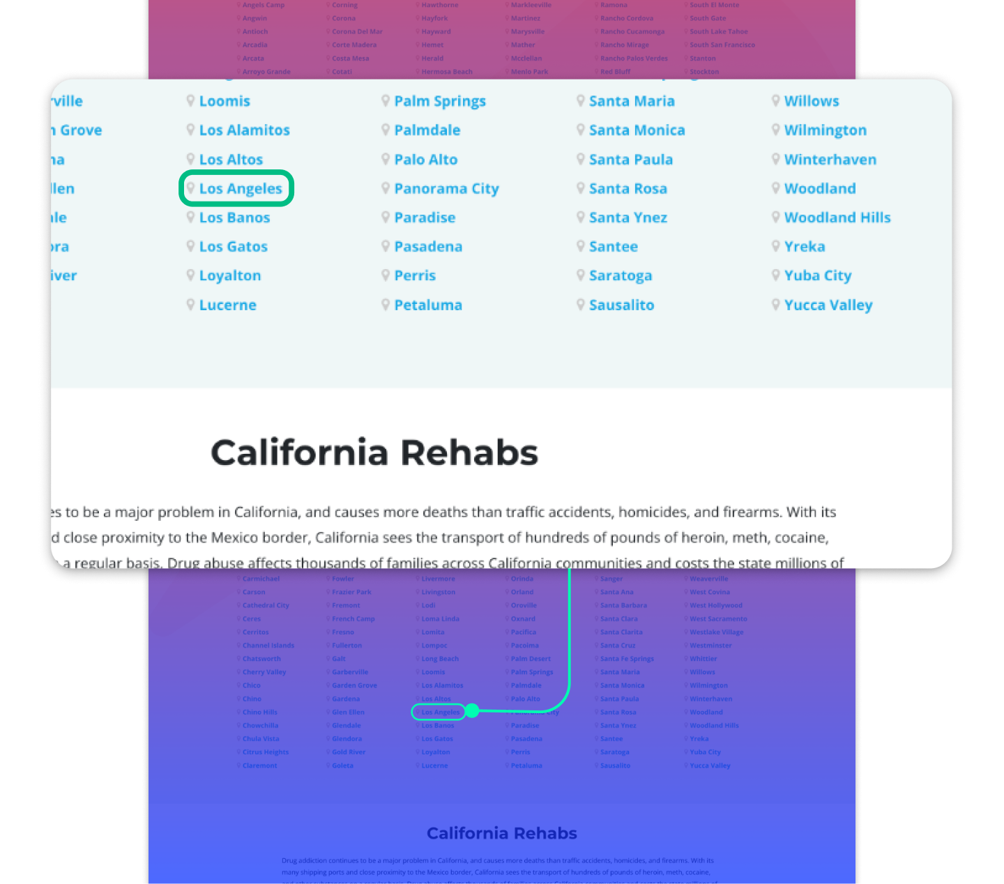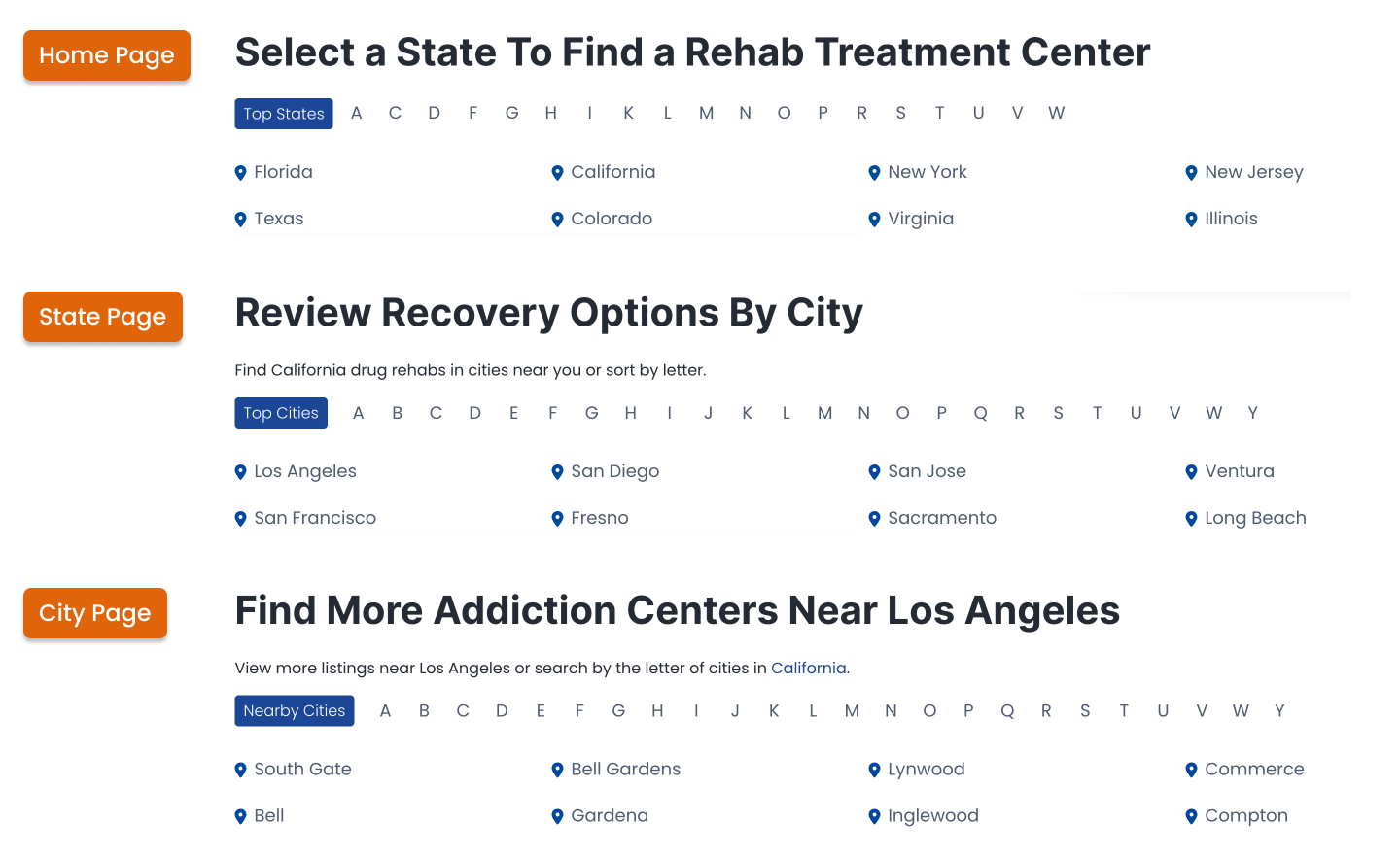 I designed three filter types with unique messaging for each template to increase click-through. I created default toggles to promote top states/cities or nearby cities upon page load to showcase the state/city nearest to the user. In addition, our internal population count determined which state/city is present in the module. The toggle by letter allows users to find a rehab in their desired location and creates room for CRO goals.