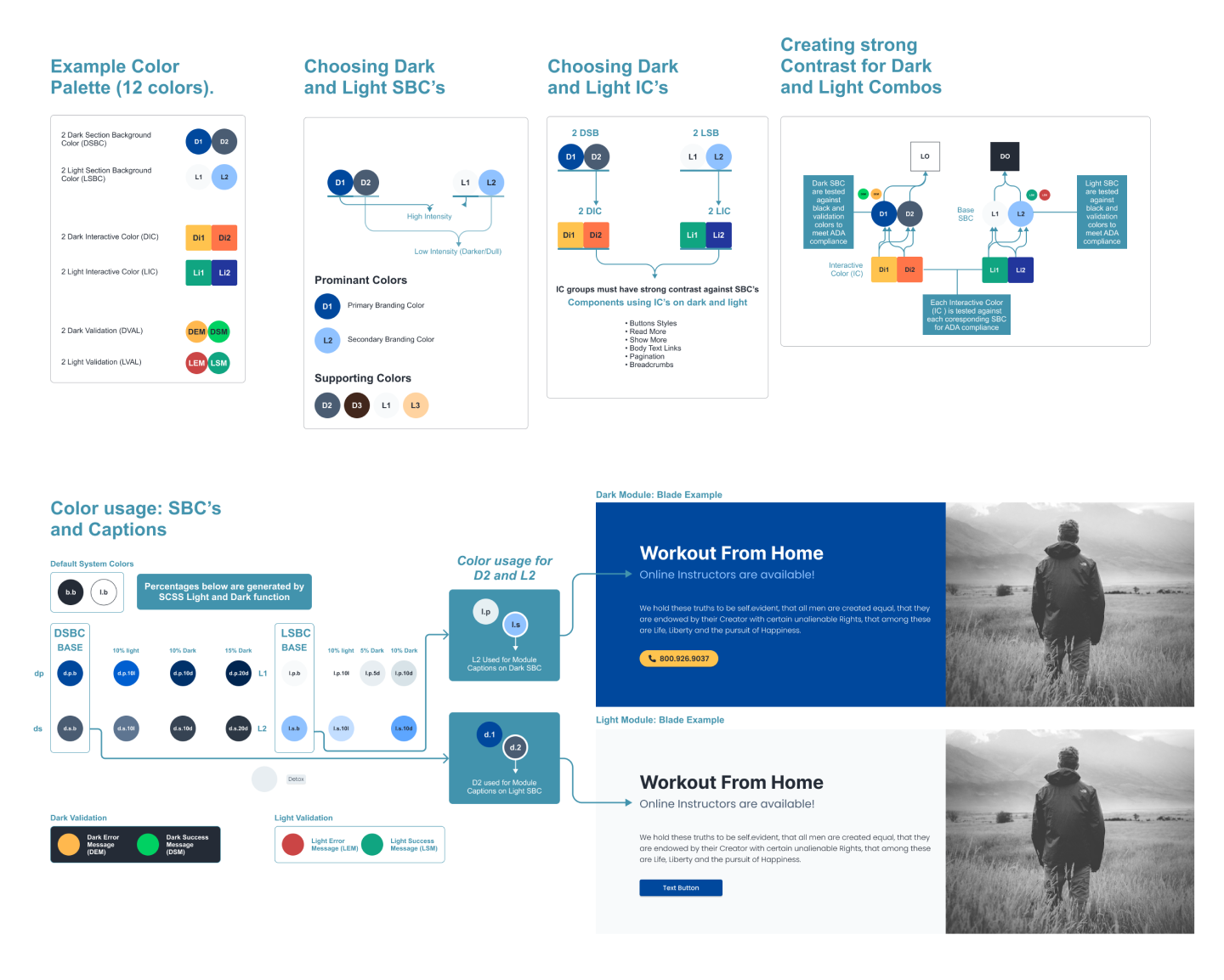 I then created color logic and mapping to separate dark and light colors. I achieved ADA compliance by classifying Section Background Colors (SBCs) and Interactive colors (ICs) within a module. The diagram below shows the relationship between those color groups. In other words, the diagram instructs that dark text (elements with D0) cannot coincide with a module containing a dark section background color. That would result in conflicting logic and poor contrast for the user.