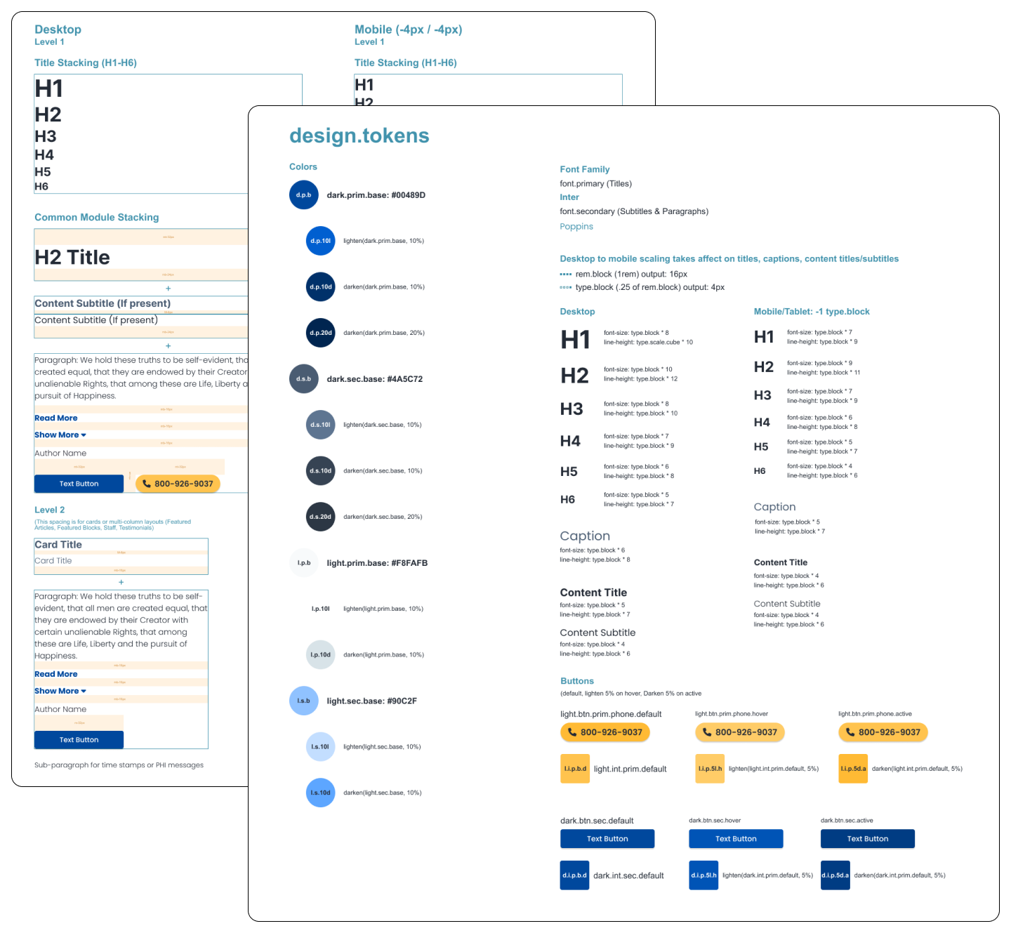 I started by creating a design system to support the new brand. I first selected primary and secondary brand colors to represent the new theme. Then I used SCSS functions to derive dark and light variations of the primary colors and translated them into design tokens. I implemented a typography token called type.block in order to divide up 1rem (16px) into 4px blocks for precision. It allowed us to define the responsive typography for different screen sizes.