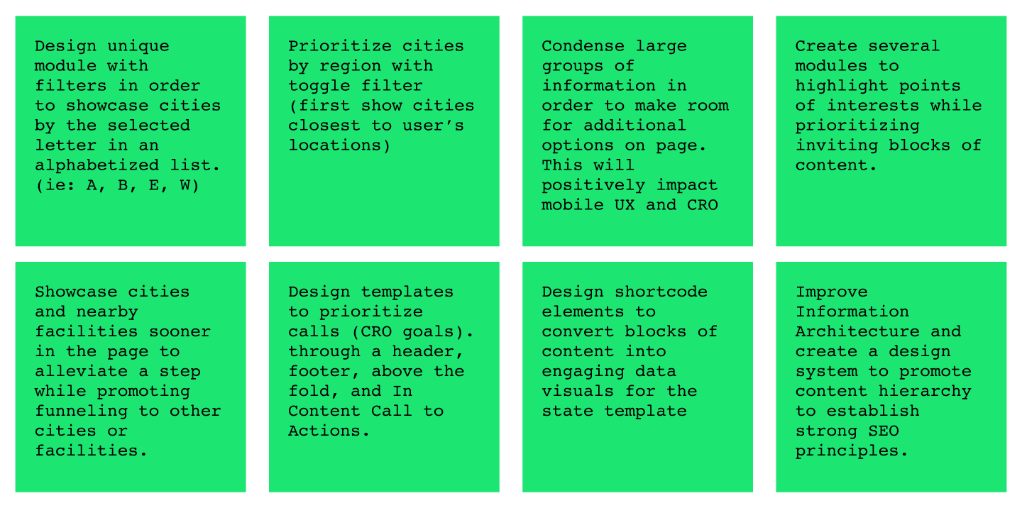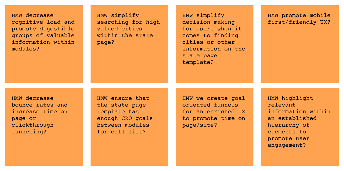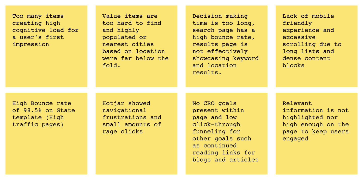 In this phase, I aimed to identify obvious UX pain points and issues with more complexity. After writing out many problems, the team and I voted on prioritizing 8 of the issues to move them along to the next phase. One of those issues included a high bounce rate on the State page template.