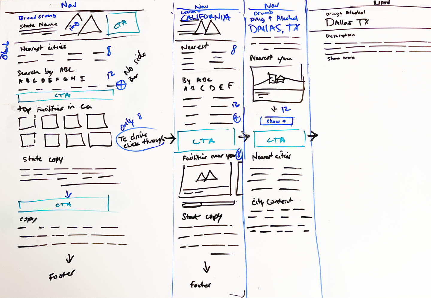 I had to move fast! Here is an example of the wireframing that took place as we moved quickly to redesign and develop the state page template for all 50 states. I established CRO goals and strong positive UX patterns by condensing information to locate rehab facilities nearest to the user.
