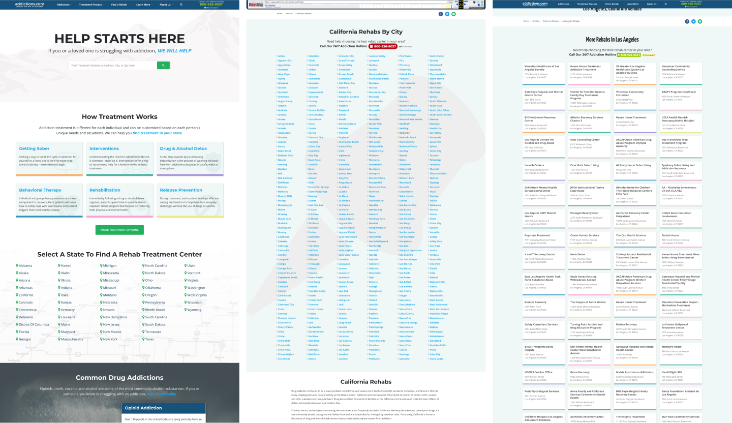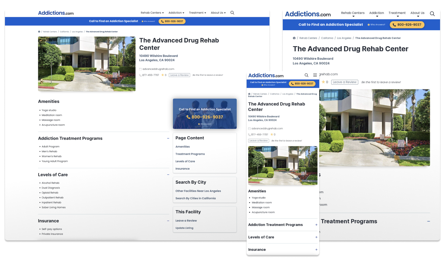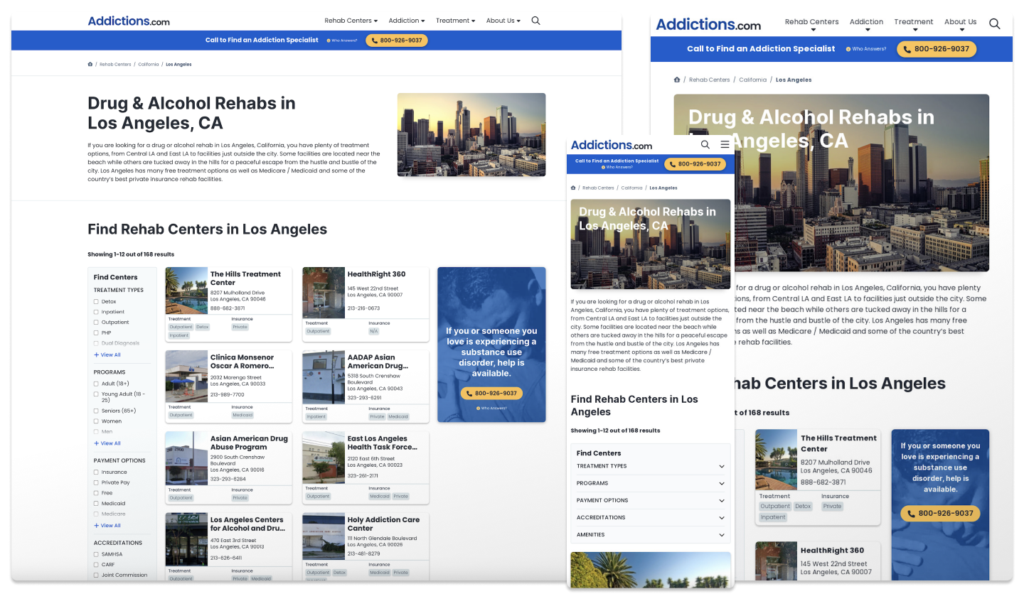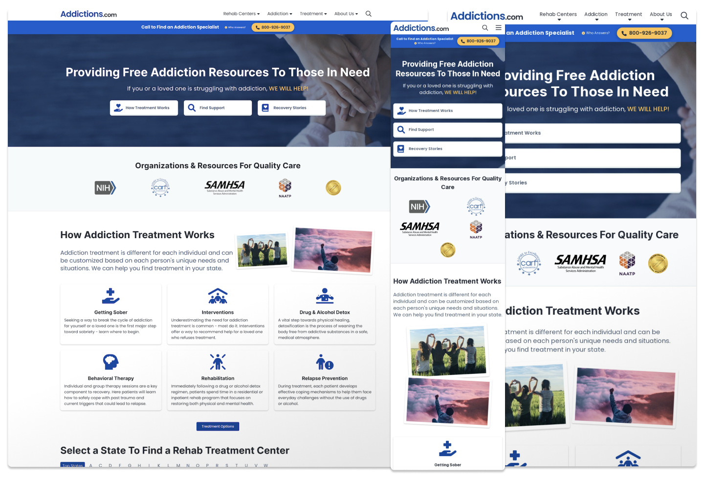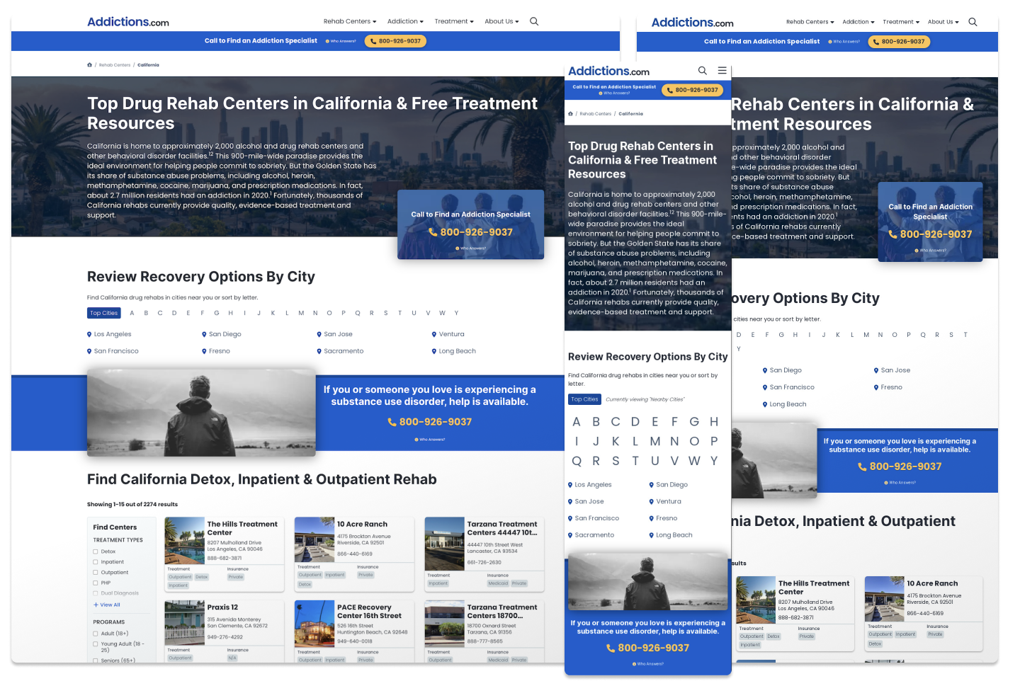 This is a design case study encompassing the transformation of addictions.com, involving strategic UX enhancements, UI refinements, conversion rate optimization (CRO) initiatives, and rigorous A/B testing. Our mission was to revamp and elevate the user experience, with a primary focus on amplifying call conversions.