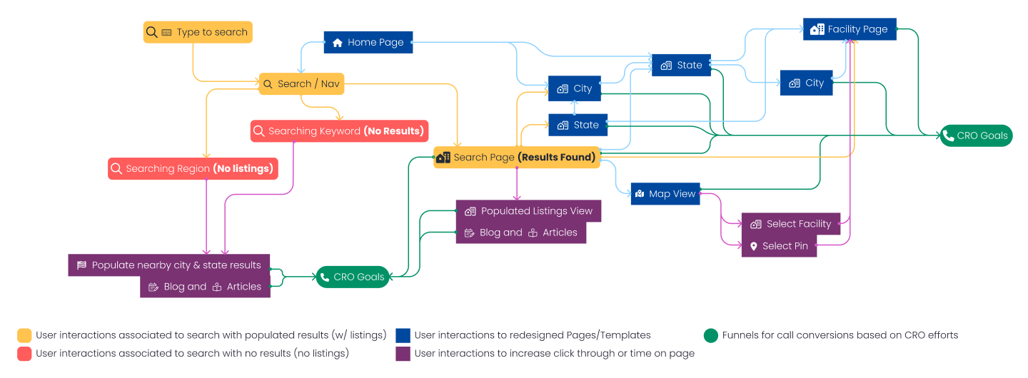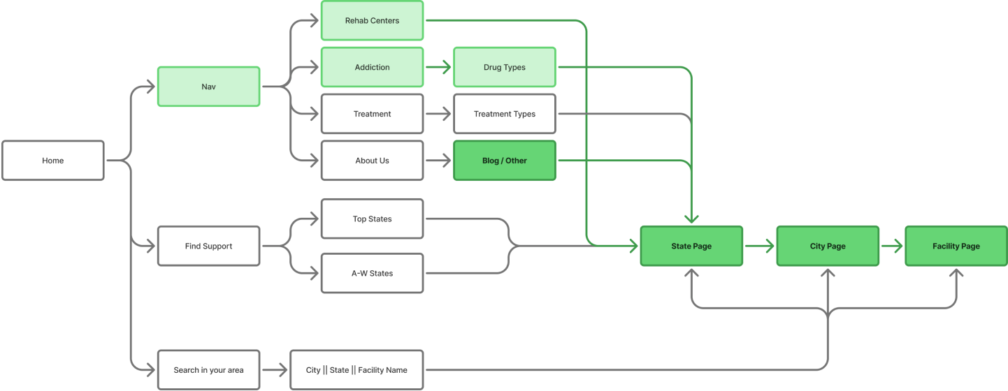 State, City, and Facility pages (highlighted in green) were identified as high value pages, optimized to support user intent and drive high-value actions such as calls or inquiries.
