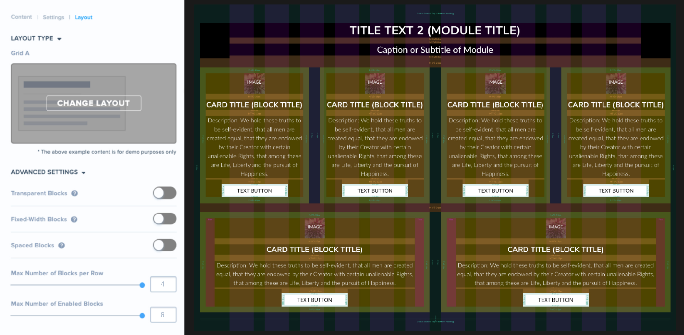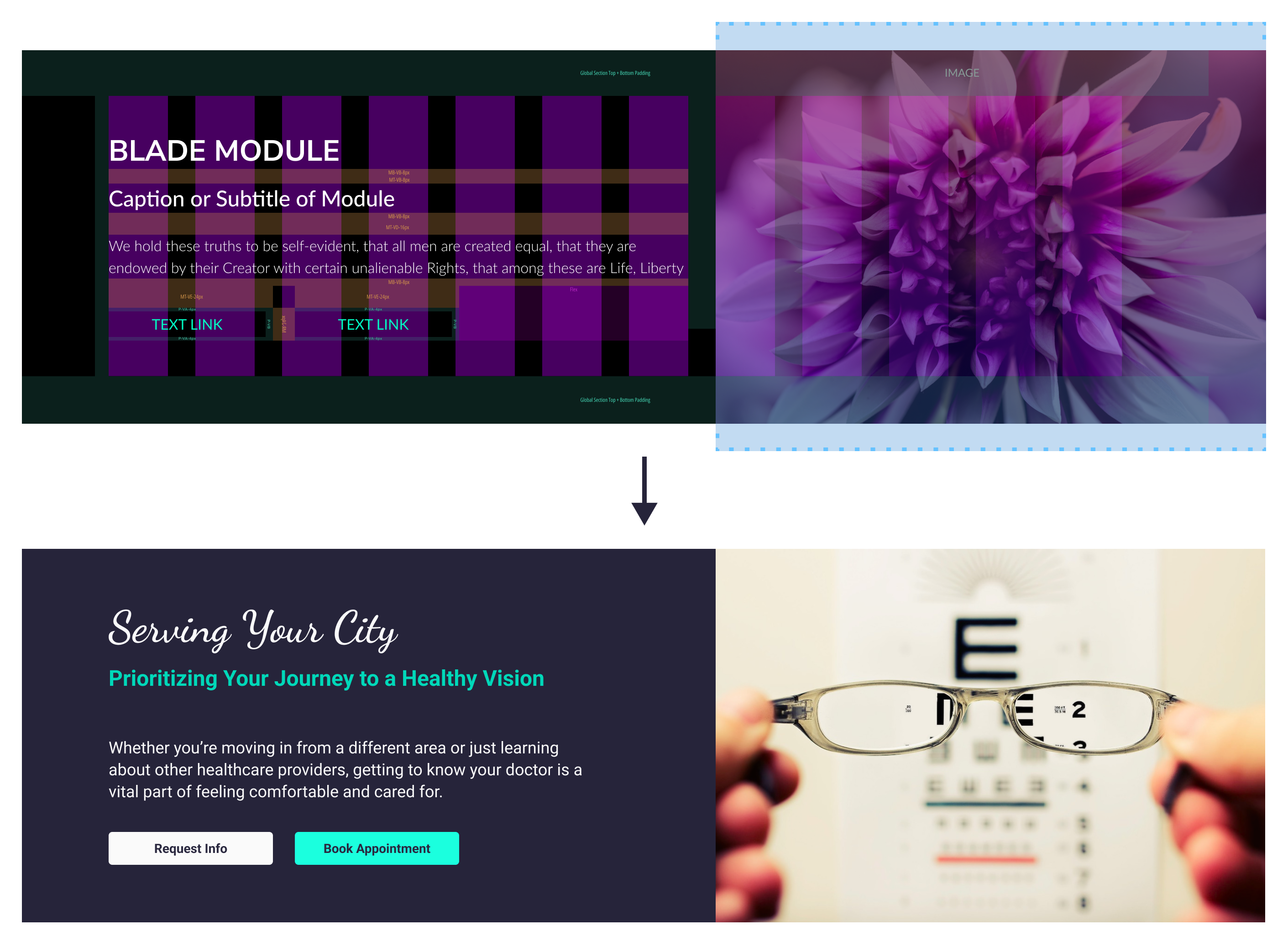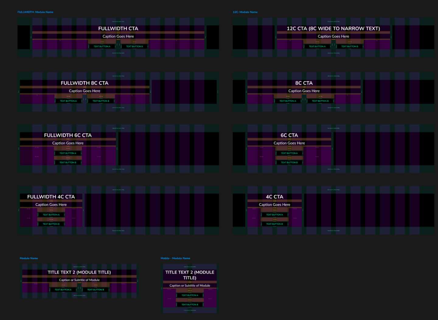 I created instructions for logic and behavior to module settings, layout options, and restrictions for component scalability. This involved multi-layout modules (12-4 columns) with the ability to hide or disable components such as images, text fields, buttons, etc., which ultimately affect a module's height, flexibility, and presentation.