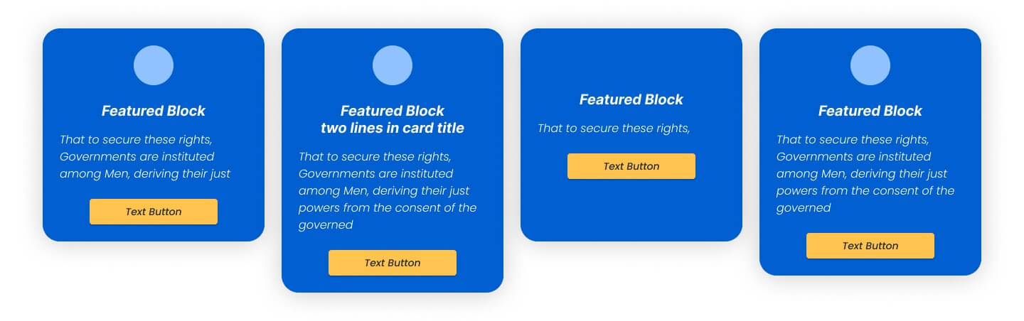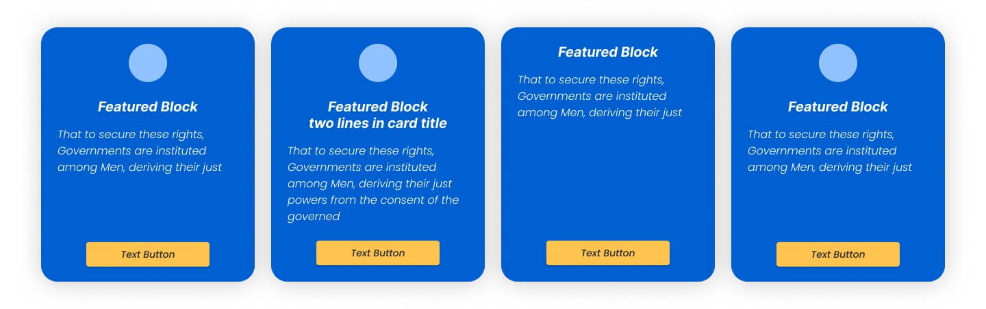 Improving Visual Alignment: Here, we present an illustration of the featured blocks module lacking precise button alignment and a well-defined minimum height. Prior to my involvement, the initial designs failed to consider diverse user scenarios. Given that users have the freedom to populate various elements within a featured block, including the title and icon, the oversight of these conditions could lead to unintended alignment issues, particularly in cases where buttons or card heights resulted in a disjointed appearance.