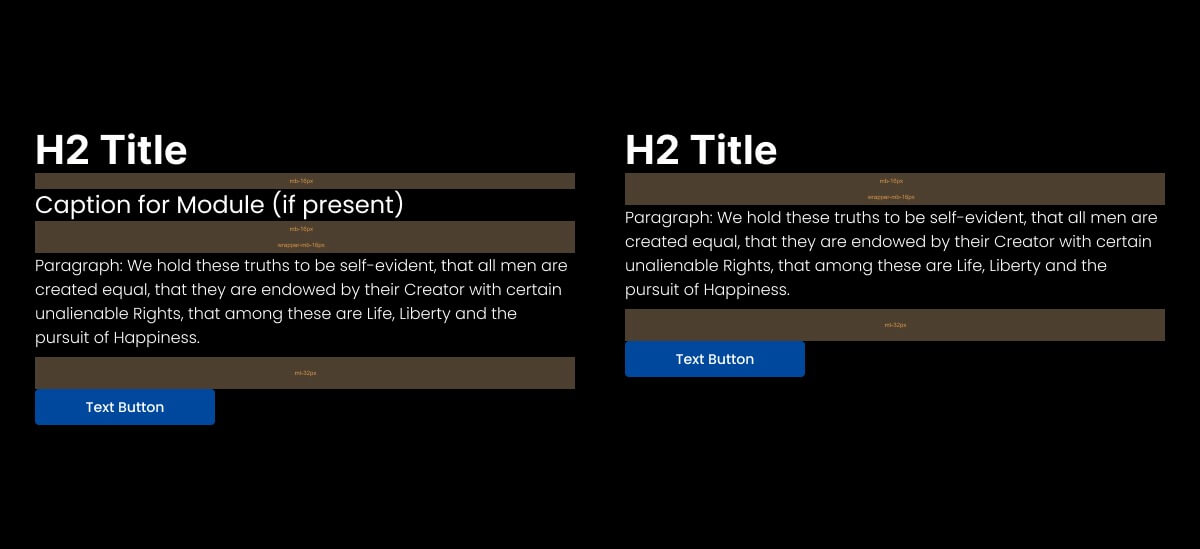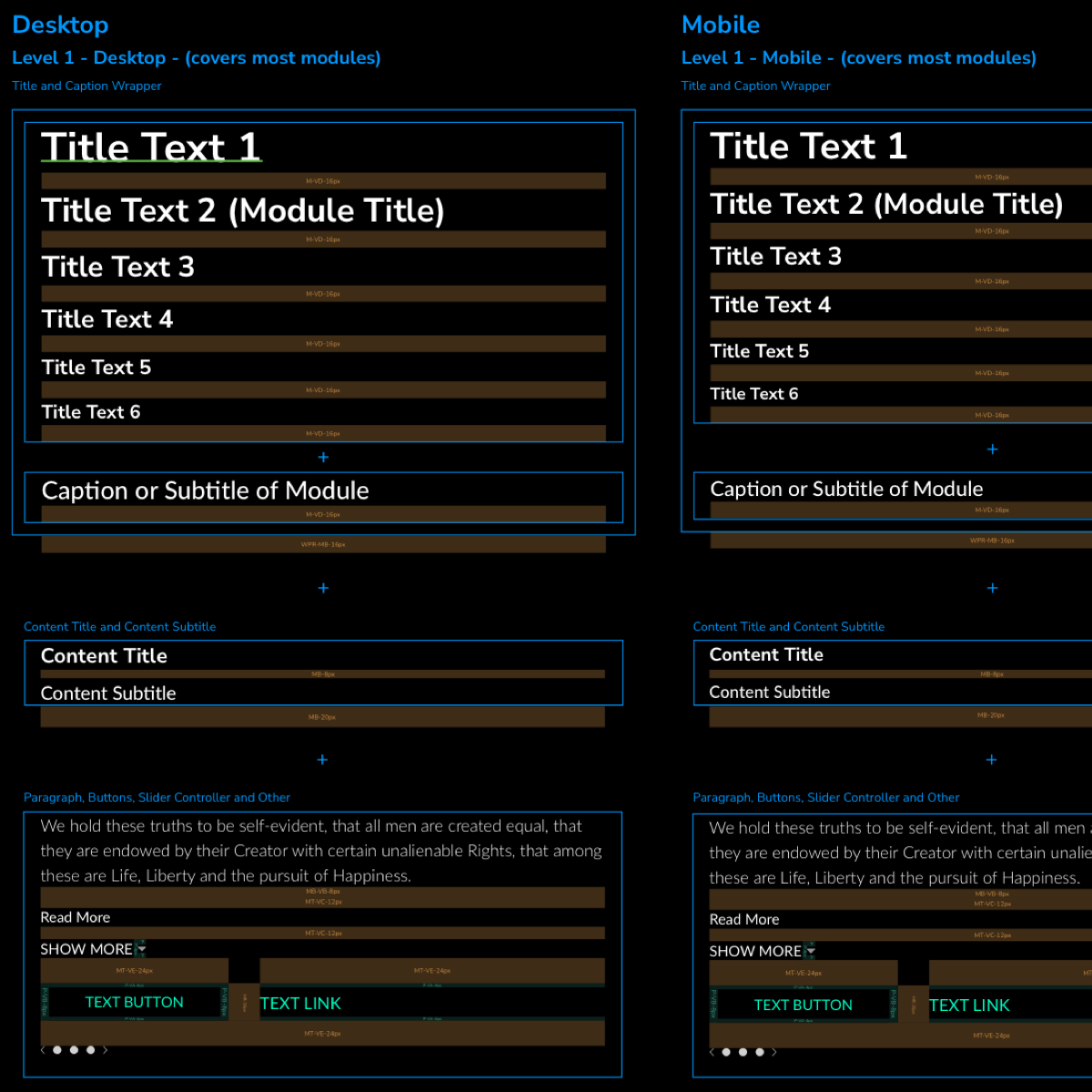 I realized the importance of including module specifications to clearly demonstrate the intended behaviors, including typography and scaling, default flex properties, margin and padding variations, stacking orders, and more. These specifications are essential for effectively communicating module settings and behaviors to users.